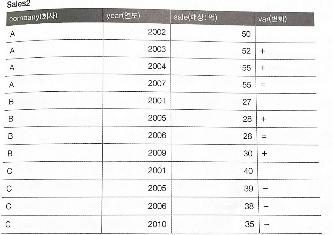 - Sales2: ๋งค์ถ ๋ณํ๋ฅผ ๋ํ๋ด๋ var ํ๋๋ฅผ ์ถ๊ฐํ ํ ์ด๋ธ